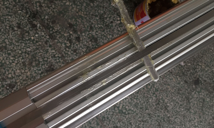 如圖掀起密封鋼帶用帶油的鋼片(或其他的小工具)伸入將油脂涂抹于鋼帶表面,然后將其貼合,保養完成。