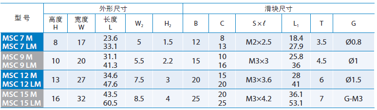 PMI-銀泰微小型直線導軌MSC9LM滑塊是一款加長型微小型滑塊,采用不銹鋼材質,滑塊的尺寸為41.3*20,滑塊上有4個M3的螺紋孔,其孔距為15*16,MSC9LM滑軌的安裝孔距為20,MSC9LM滑塊與滑軌的組合高度為10。所有尺寸完全與臺灣上銀直線導軌MGN9H相同。兩者之間可相互替換,在防塵方面,銀泰直線導軌比上銀直線導軌做得更佳出色。性價比更高.