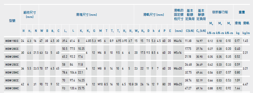 上銀導軌HGW30CC滑塊其它數據如下: