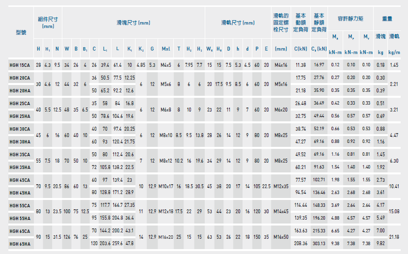 上銀直線導軌HGH65HA滑塊長259.6,寬126,是一款四方型超重負荷加長型滑塊,能承受更大的負載,HGH65HA上銀滑塊上面有4個M16的螺紋孔,其孔距是120*76,滑軌加滑塊的組合高度為90,上銀直線導軌HGH65HA的固定螺絲為M16,安裝孔之間的距離為150,由于體積比較大,目前多應用于大型機械中,例如:龍門銑,大型磨床等