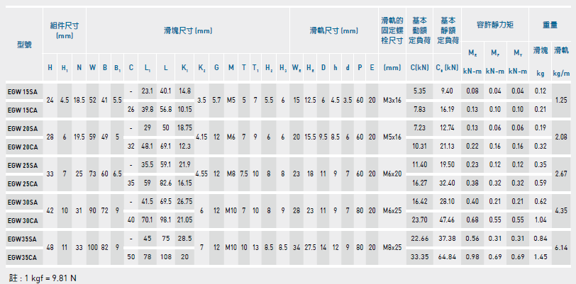 基本靜額定負荷的數值詳列于各規格尺寸表中;使用者可參照表格選用適合的直線導軌,但必須注意的是被選用的直線導軌在運行中所受的最大靜負荷不可超過其基本靜額定負荷。