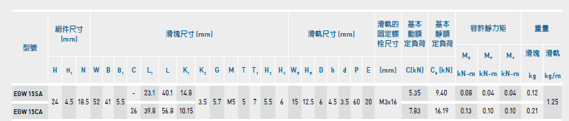高組裝系列:HGH-CA /HA、HGW-CA/HA 規格大小:15~65;低組裝系列:EGH-SA/CA、EGW-SA/CA 規格大小:15~30